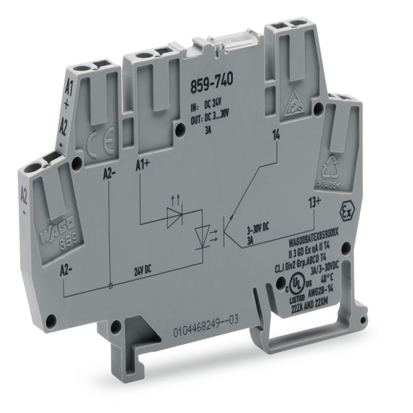 Fiche technique – Module optocoupleur; Tension nominale d’entrée DC 24 V; Plage de tension de sortie DC 3 … 30 V; Courant permanent max. 5 A; raccordement 2 conducteurs; Largeur 6 mm; gris 859-740 WAGO