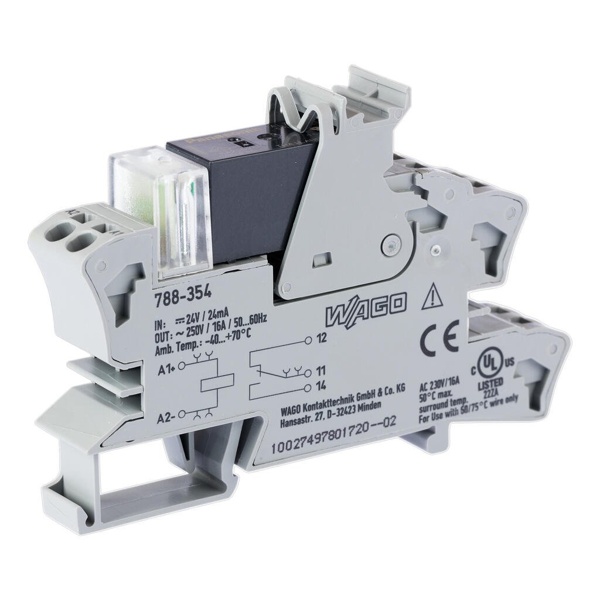 Module relais; Tension nominale d’entrée DC 24 V; 1 RT; Limitation courant constant 16 A; pour charges de type lampes; Indication d’état rouge; Largeur 15 mm; 2,50 mm²; gris 788-354 WAGO, Remarque de sécurité 1 Pour des tensions supérieures à 250 V entre modules relais connectés et pour respecter l’isolation renforcée, il faut utiliser un séparateur (par ex. 209-191)., Remarque Isolation renforcée entre bobine et contacts