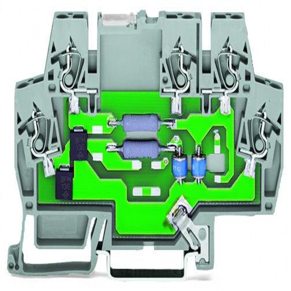 Module de protection contre les surtensions pour technique de signaux; Tension nominale DC 24 V; pour 2 chemins de signaux avec dérivation commune; pour interfaces dissymétriques; 2 étage; Largeur : 6 mm; 2,50 mm² 792-800 WAGO, Remarque Le signe de coordination indique l’effet de protection ainsi que le pouvoir de décharge du dispositif dérivant les surtensions., Tension de fonctionnement DC 24 V, Tension permanente max. AC 23 V / DC 33 V, Courant nominal 0,5A, Courant décharge (8/20 µs) 5 kA, Courant décharge 8/20µs 10 kA