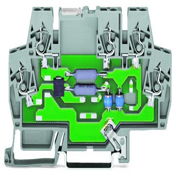 Module de protection contre les surtensions pour technique de signaux; Tension nominale DC 24 V; pour 2 chemins de signaux avec dérivation commune; pour interfaces symétriques; 2 étage; Largeur : 6 mm; 2,50 mm² 792-801 WAGO, Remarque Le signe de coordination indique l’effet de protection ainsi que le pouvoir de décharge du dispositif dérivant les surtensions., Tension de fonctionnement DC 24 V, Tension permanente max. AC 23 V / DC 33 V, Courant nominal 0,5A, Courant décharge (8/20 µs) 5 kA, Courant décharge 8/20µs 10 kA