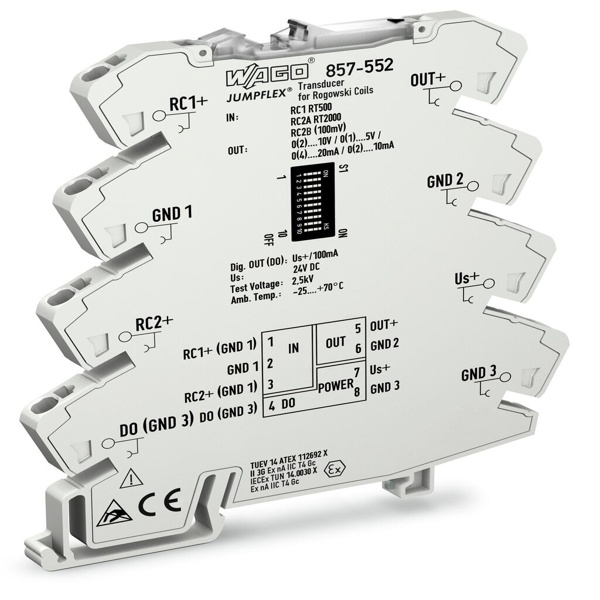Convertisseur de signal; Entrée pour boucles Rogowski; Signal de sortie de tension et de courant; Sortie digitale; Configuration par logiciel; Tension d’alimentation 24 V DC; Largeur 6 mm; 2,50 mm² 857-552 WAGO, Remarque autres possibilités de réglage par l’interface du logiciel de configuration WAGO ou par l’interface de l’application de configuration WAGO, Possibilités configuration Commutateurs DIP